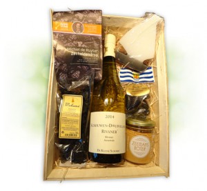 Einzelflasche Wein ‚Brut de Zelande‘ in dekorativer Holzkiste